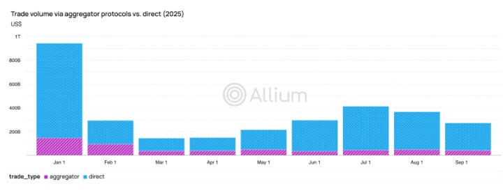 Aggregator protocols are rarely used in practice: Only ~17% of Solana DEX trade volume is routed through aggregators.